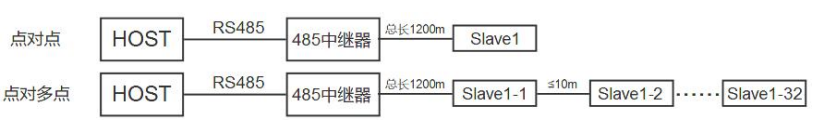 (1)单个中继器:点对点连接一个485输出设备,通信距离延长1200米;点对多点连接32个485输出设备,相邻485设备距离不超过10m,总线延长1200米