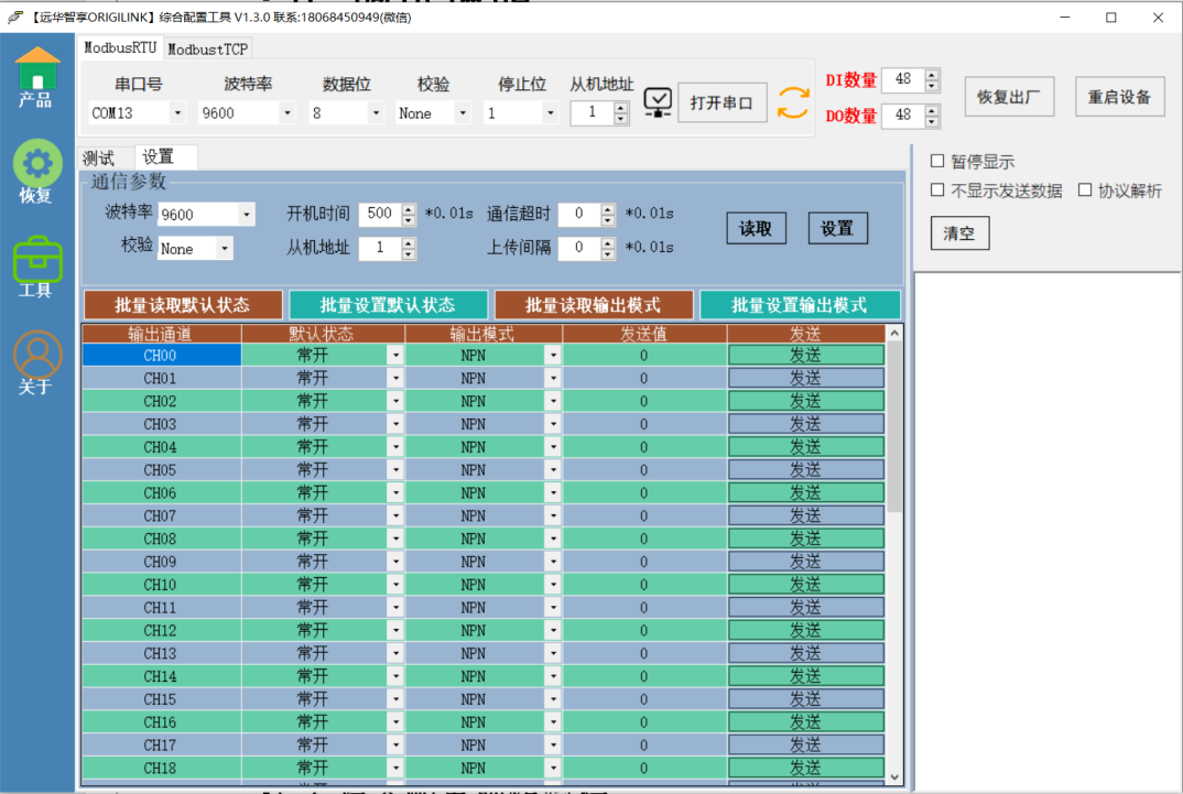 本产品继电器或MOS管开机默认状态支持设置常开(无输出)或常闭(有输出),并掉电保存。
