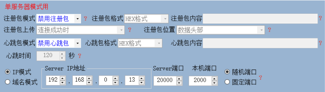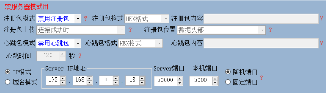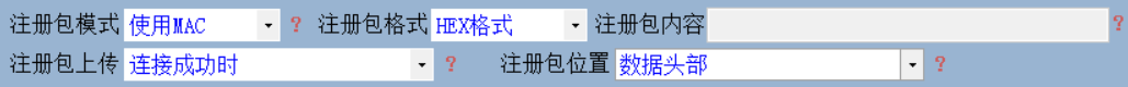 在TCP client、UDP client、双服务器、三服务器、MQTT模式下,注册包模式可选禁用、使用MAC、使用自定义。
