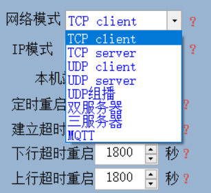 | 工作模式 | TCP client、TCP server UDP client、UDP server UDP组播、双服务器 三服务器、MQTT |
