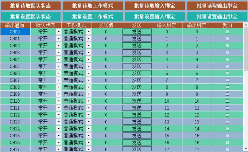 比如通道1输出通道的输出绑定到通道0,那么当通道0动作时,输出通道1将会跟随通道0同步动作,如果选择了“输出反向”,则动作会与通道0相反。