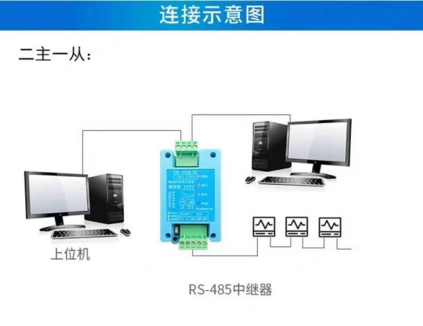 (1)单个中继器:点对点连接一个485输出设备,通信距离延长1200米;点对多点连接32个485输出设备,相邻485设备距离不超过10m,总线延长1200米