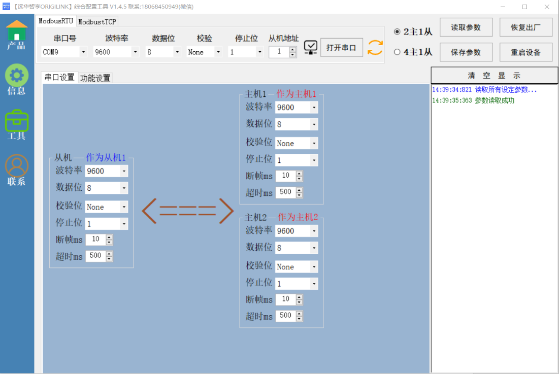 - 2主1从设备,可配置成2主站1从站,或2从站1主站模式