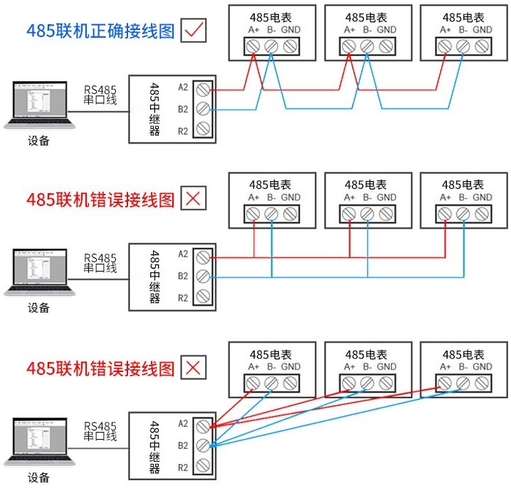 - 如果在通信过程中不稳定,在最后一台设备的A和B上并接120欧姆的终端电阻