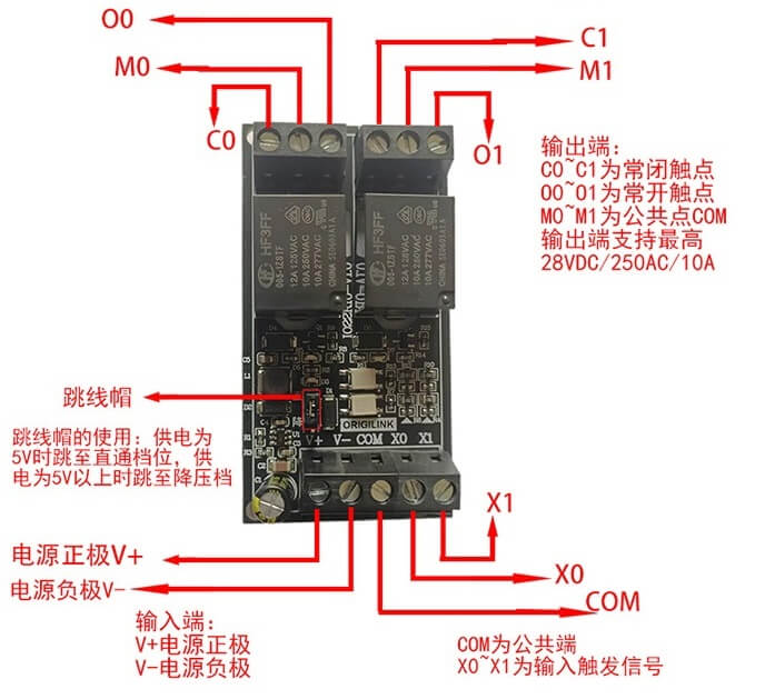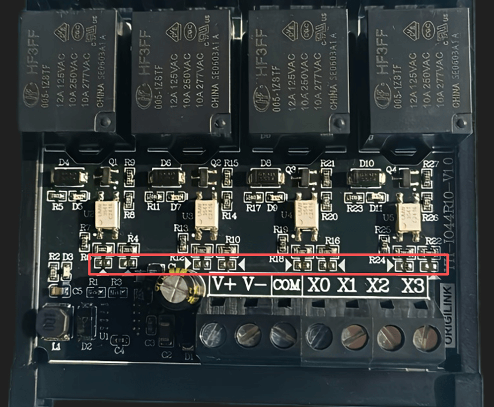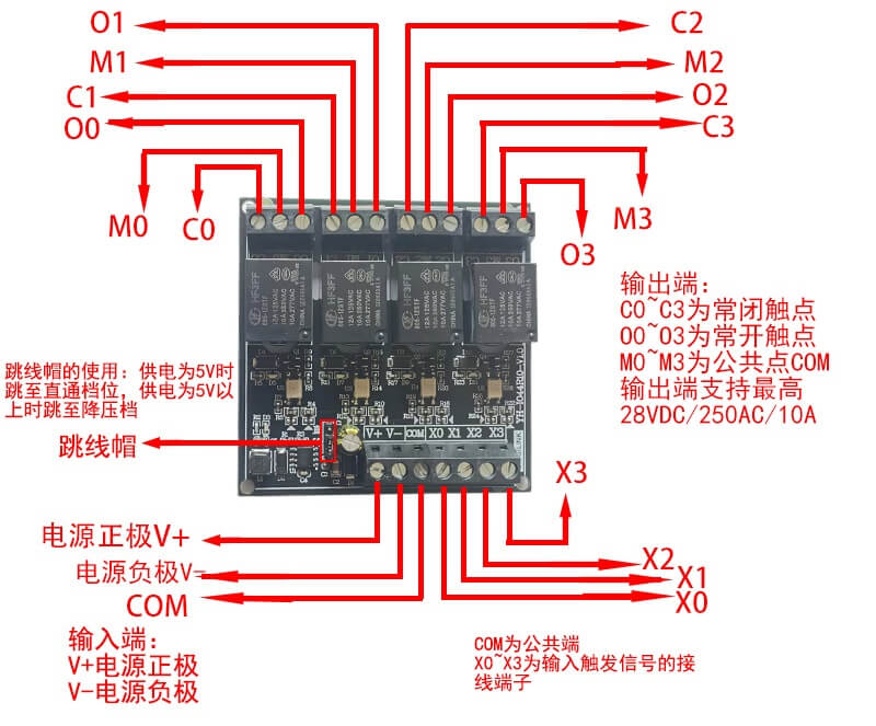 NPN低电平有效时,信号需要接到输入侧的X0、X1、X2、X3,输入侧的公共端需要接(V+端子)信号正极。 V+接供电电源正极,V-接供电电源负极(0V)GND,由外部给板子供电。- 供电侧、信号输入侧和输出侧是三端电气隔离的。