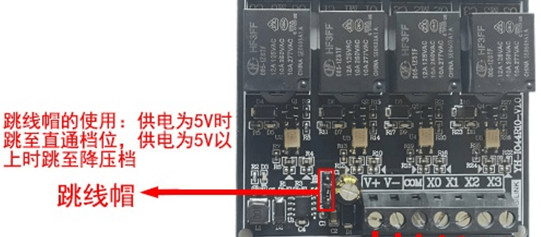 当供电电压是12-24V时,需要将跳线帽将位置,意为降压供电;