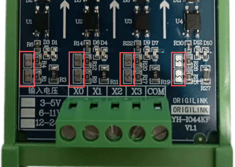 当输入信号电压是12-24V时,需要用烙铁断开对应通道,断开时请务必用万用表蜂鸣器档测试是否断开,防止短接点虚连导致烧坏内部电路。