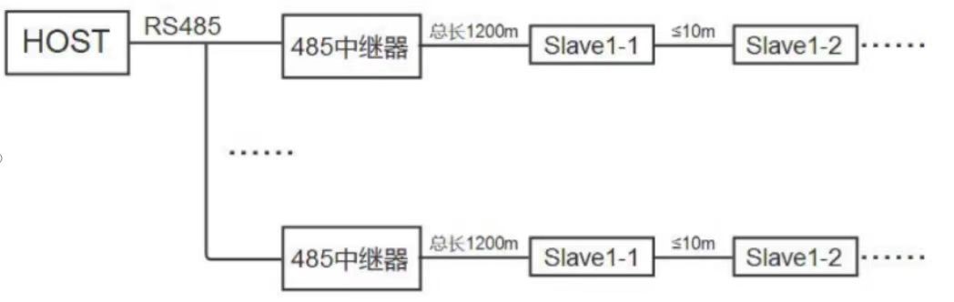 (1)单个中继器:点对点连接一个485输出设备,通信距离延长1200米;点对多点连接32个485输出设备,相邻485设备距离不超过10m,总线延长1200米