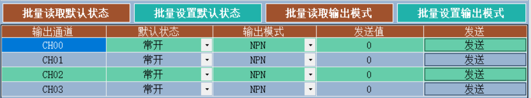 本产品MOS管输出可配置输出模式为NPN模式(低电平输出)或PNP模式(高电平输出),并掉电保存。每个通道输出模式独立,互不影响。