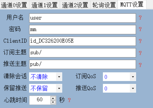 MQTT模式下,clientID默认为“id_(MAC地址)”,其他信息用户可根据需求设置。