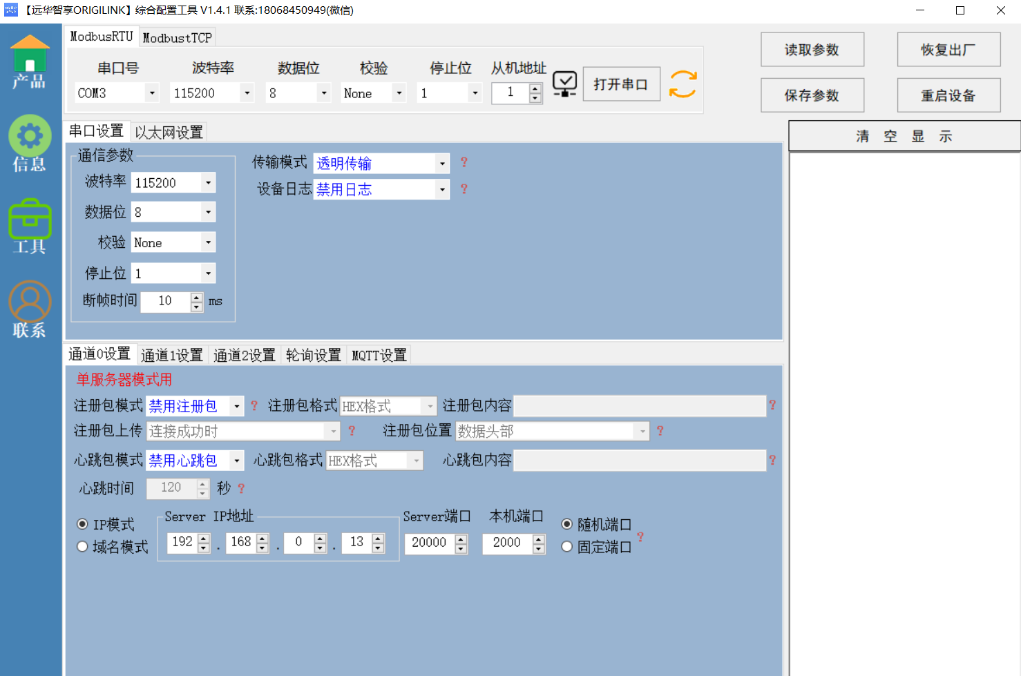 ⚠️注意:使用注册包时,只能工作在“透明传输”模式下,在“modbus-RTU转TCP”模式无效。