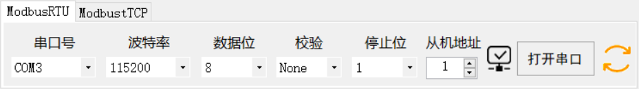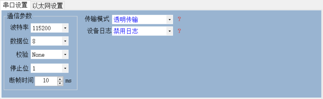 设备串口参数设置界面如下图,波特率范围:4800bps~460800bps,数据位固定8位,校验位位NONE/ODD/EVEN,停止位默认1位。