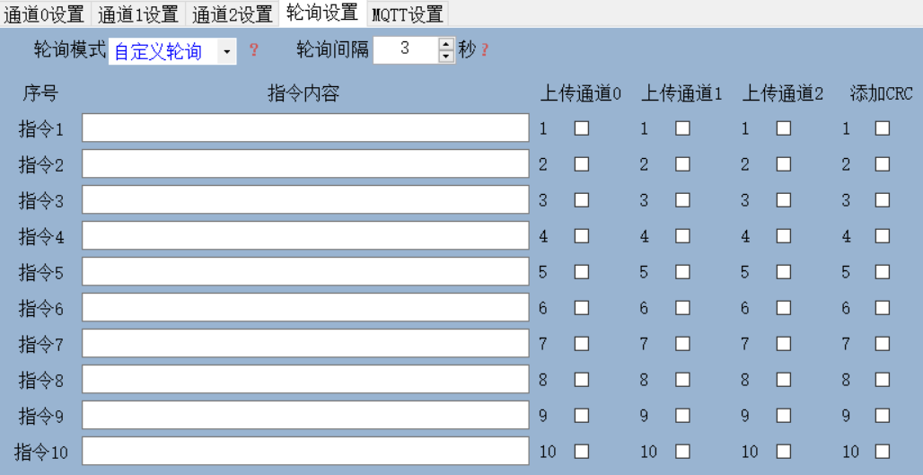 | 主动轮询 | 最大轮询10条指令,每条指令可配置上传服务器通道 |