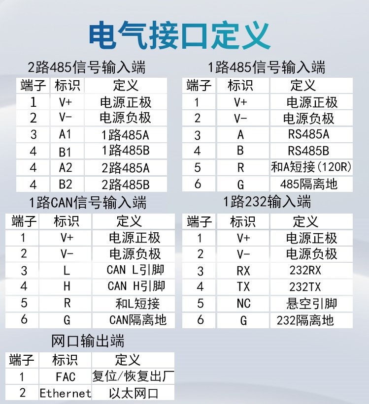- 1路下行接口可选RS485、RS232、CAN2.0A/B
