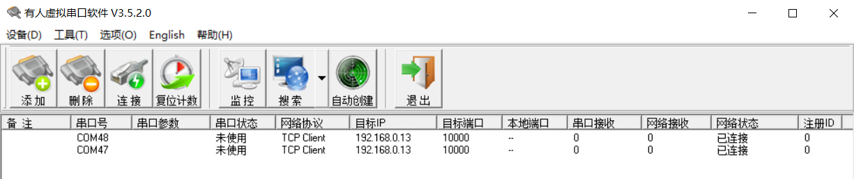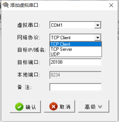 安装USR-VCOM软件后,“添加”虚拟串口配置如下图: