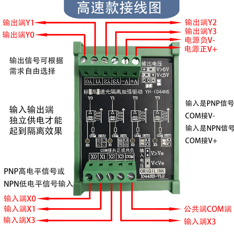 🔶Tips:输出侧V+、V-供电可选3.3-5V和12-24V供电。当选择3.3-5V供电时,V+和V-供电多少伏,输出信号高电平就是多少伏。当选择12-24V供电时,固定输出5V信号。