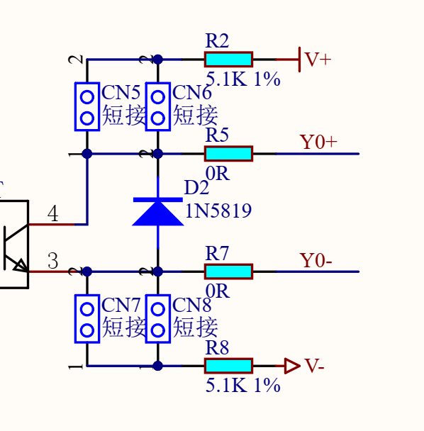以Y0通道举例: 1. 跳线帽跳到下拉电阻上,Y0-作为信号输出,Y0+用线短接到电源正(V+)。 2. 当光耦导通时,Y0-输出高电平,当光耦不导通时,Y0-被下拉到V-输出低电平。 3. 示意图如上右图