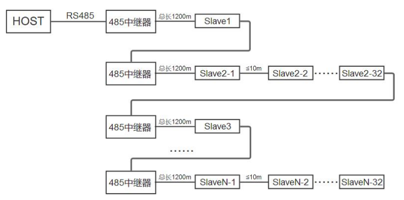 (2)级联(树形连接);接N个485中继器,无限延长RS485通信距离,拓展更多485设备,最大支持连接32设备。